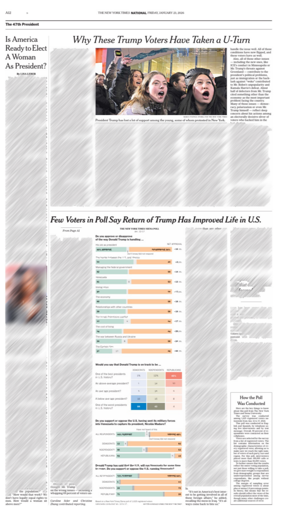 Una speranza c’è. E viene dal New York Times e dal racconto in una sua pagina che, nei giorni scorsi, è stato dedicato al rapporto tra gli elettori, anche trumpiani, e il presidente degli Stati Uniti. I sondaggi e le analisi ci dicono che probabilmente la “luna di miele” con gli elettori certamente conservatori di destra, ma moderati, sta finendo. C’è, come dice il titolo, una sorta di inversione di tendenza. In particolare, poi, gli elettori – che sono, ripeto, conservatori – ritengono che Trump si sia impegnato su priorità sbagliate. Insomma, la lotta feroce contro gli immigrati, l’utilizzo di una forza di stile nazi-fascista come l’Ice, non vengono visti come la soluzione a un Paese, gli Usa, che ha visto crescere la ricchezza di chi ricco già lo era, mentre la fascia medio bassa della popolazione non ha avuto miglioramenti nella propria situazione di vita quotidiana e a volte persino peggioramenti. Insomma, come detto, una speranza c’è ed è quella delle elezioni di novembre, di medio termine, dove Trump potrebbe perdere la maggioranza alla Camera o al Senato. Ma in quel caso, come reagirà al verdetto elettorale? E permetterà davvero che si vada al voto? Vuoi vedere che dovremo guardare agli Usa come oggi guardiamo alla Russia e alla Cina? Che tristezza.